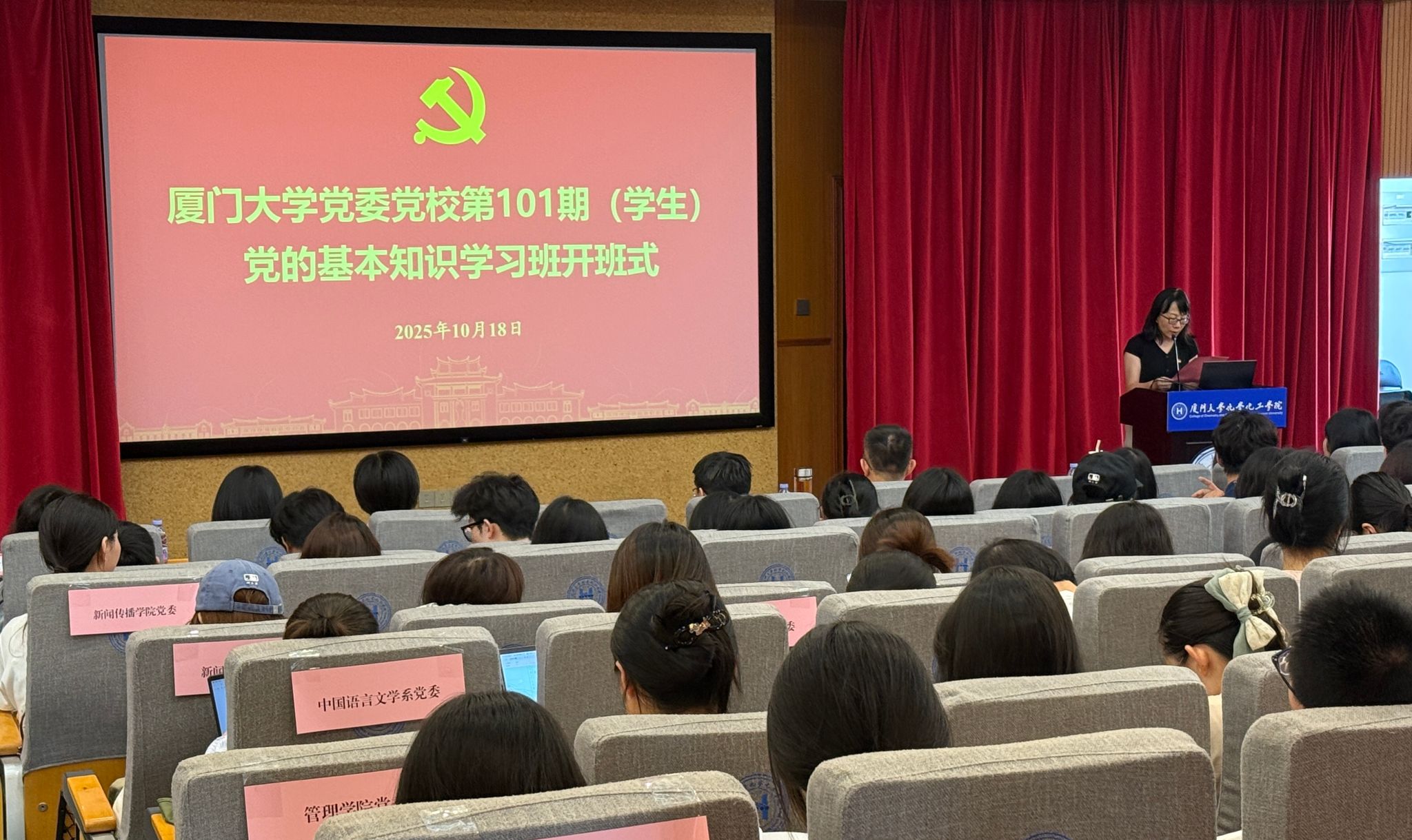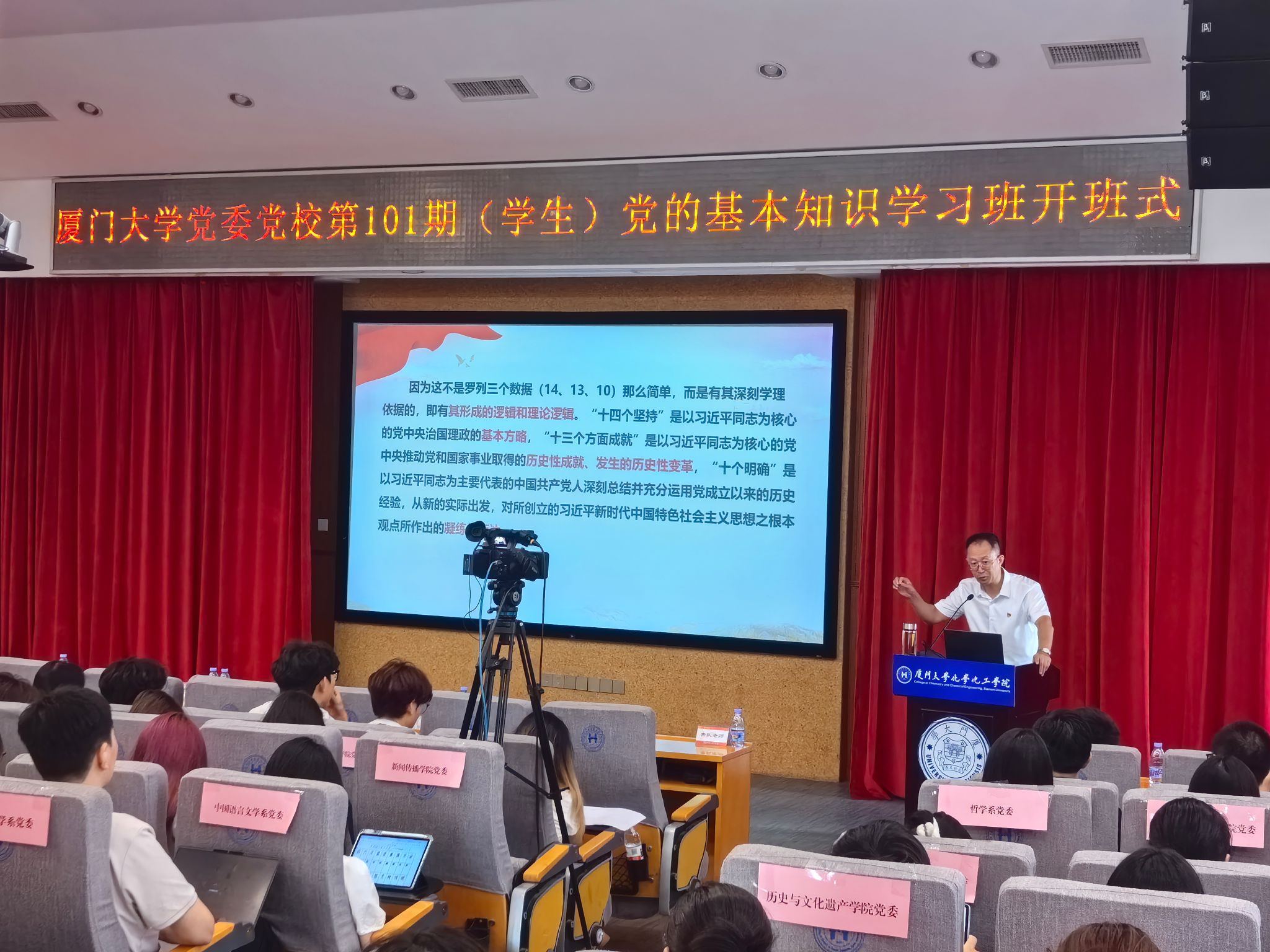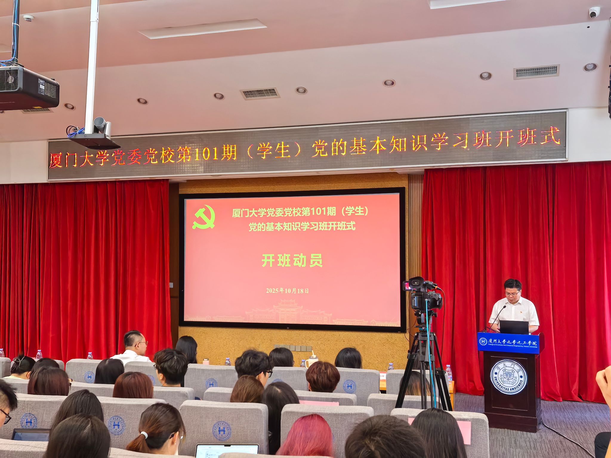 10月18日上午,厦门大学党委党校第101期(学生)党的基本知识学习班正式开班。开班式及首场报告采取“线上+线下”的形式举行,校党委党建办主任兼组织部副部长、教师工作部副部长葛郝锐,校党委党校副校长、马克思主义学院教授张艳涛,部分带队教师和学员在思明校区化学报告厅主会场参加开班式。校学生工作部(处)副部(处)长刘莉颖主持开班式。