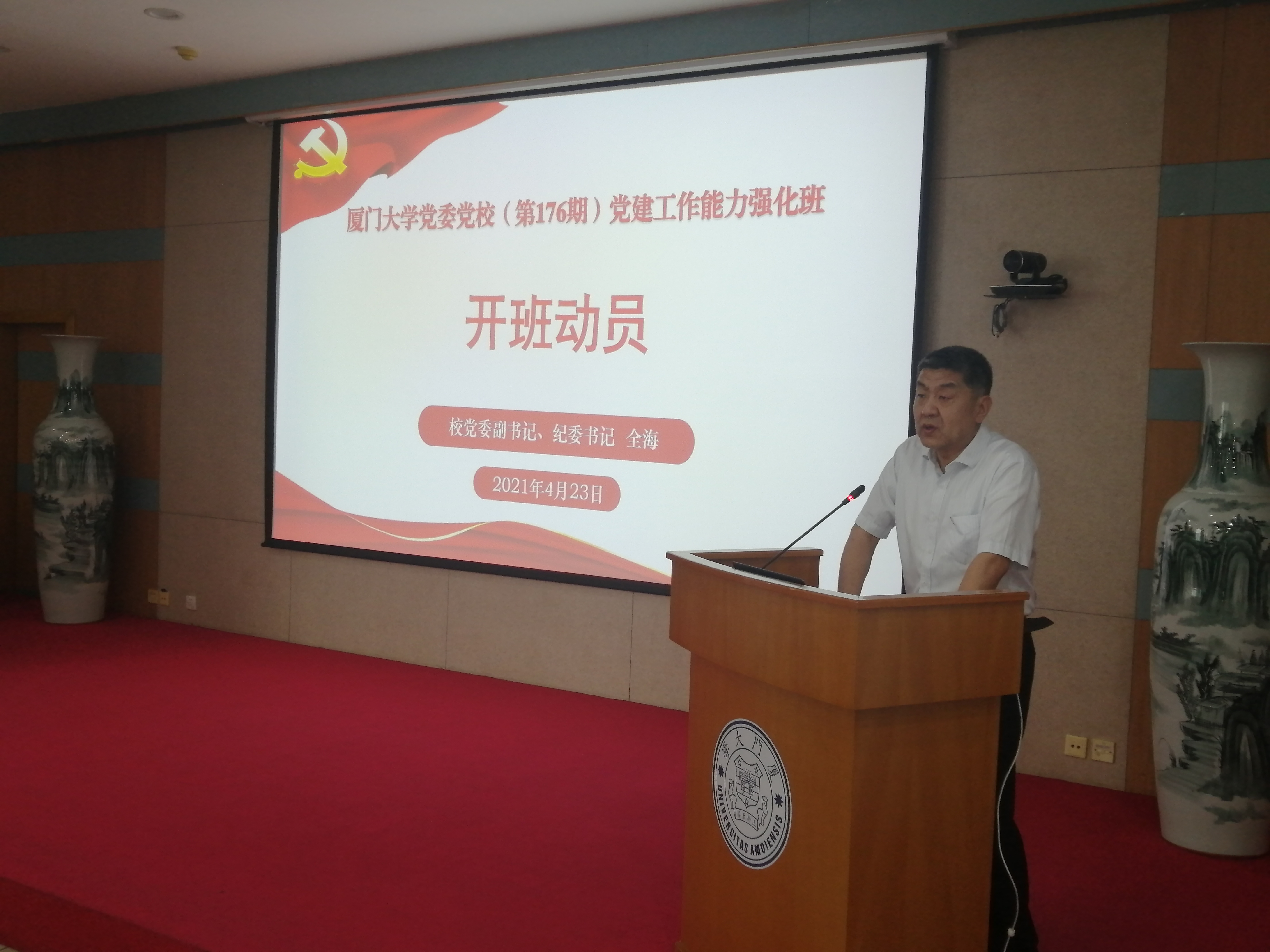 为深入学习贯彻习近平新时代中国特色社会主义思想和习近平总书记致厦门大学建校100周年的贺信精神,落实全面从严治党主体责任,扎实开展党史学习教育,进一步夯实基层党建基础,强化党建工作能力,持续提升基层党组织建设质量,以更加昂扬奋发有为的姿态迎接建党一百周年,4月23日上午,党委党校(第176期)党建工作能力强化班在颂恩楼220会议室开班。校党委常务副书记李建发应邀上专题党课。校党委副书记、纪委书记全海作开班动员。校党委党校副校长何丽新主持。